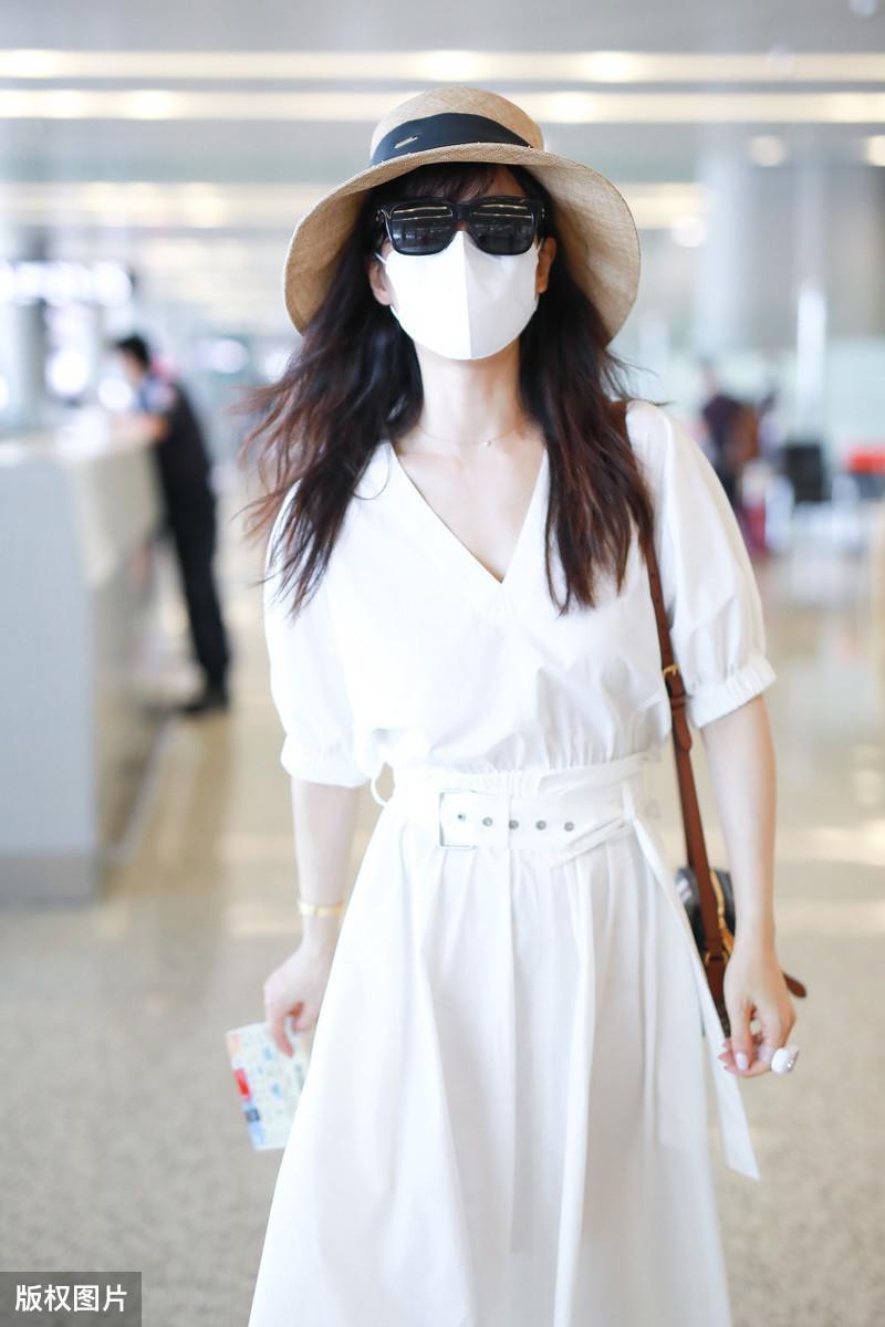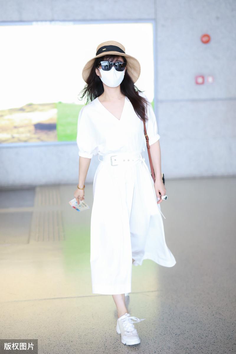 张静初,白色V领连衣裙+小白鞋+Burberry手袋+草帽夏日风情