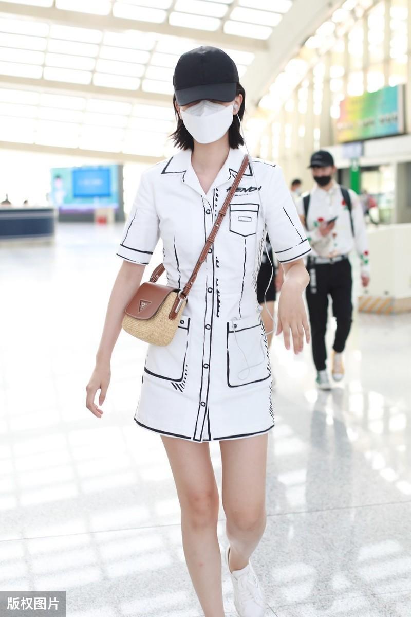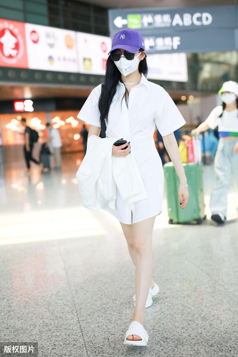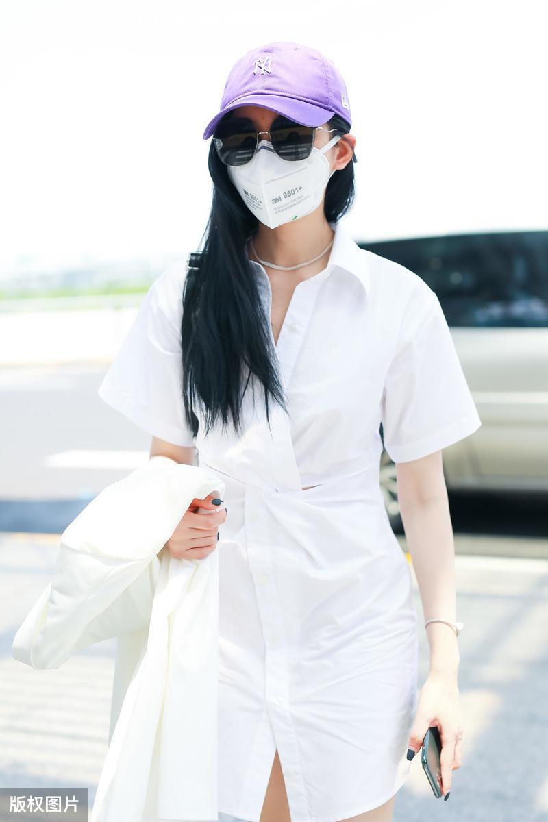 张天爱,白色衬衫裙+勃肯鞋+Valentino手袋+紫色棒球帽“下衣失踪”