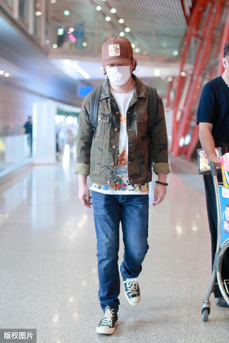 潘粤明,迷彩外套+印花T恤+牛仔裤+帆布鞋休闲随性