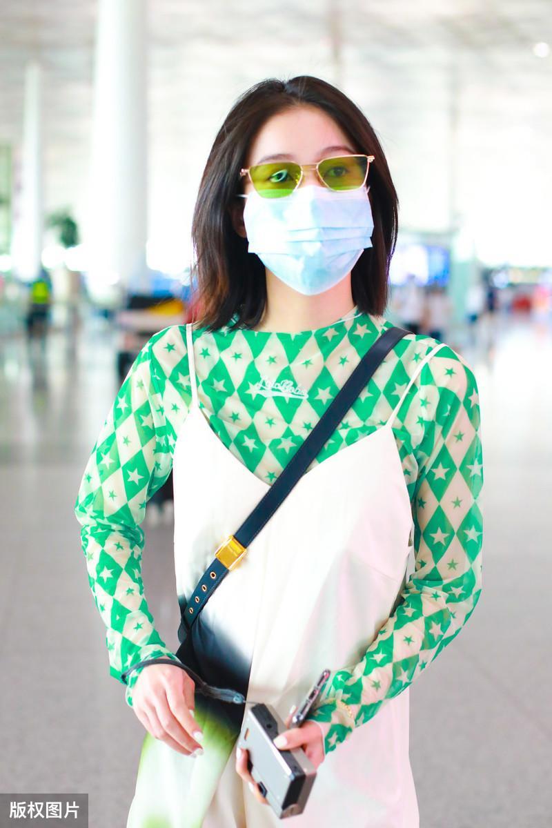 张雪迎,绿色印花上衣+吊带连衣裙+Dior手袋+粉色凉鞋精致可人。