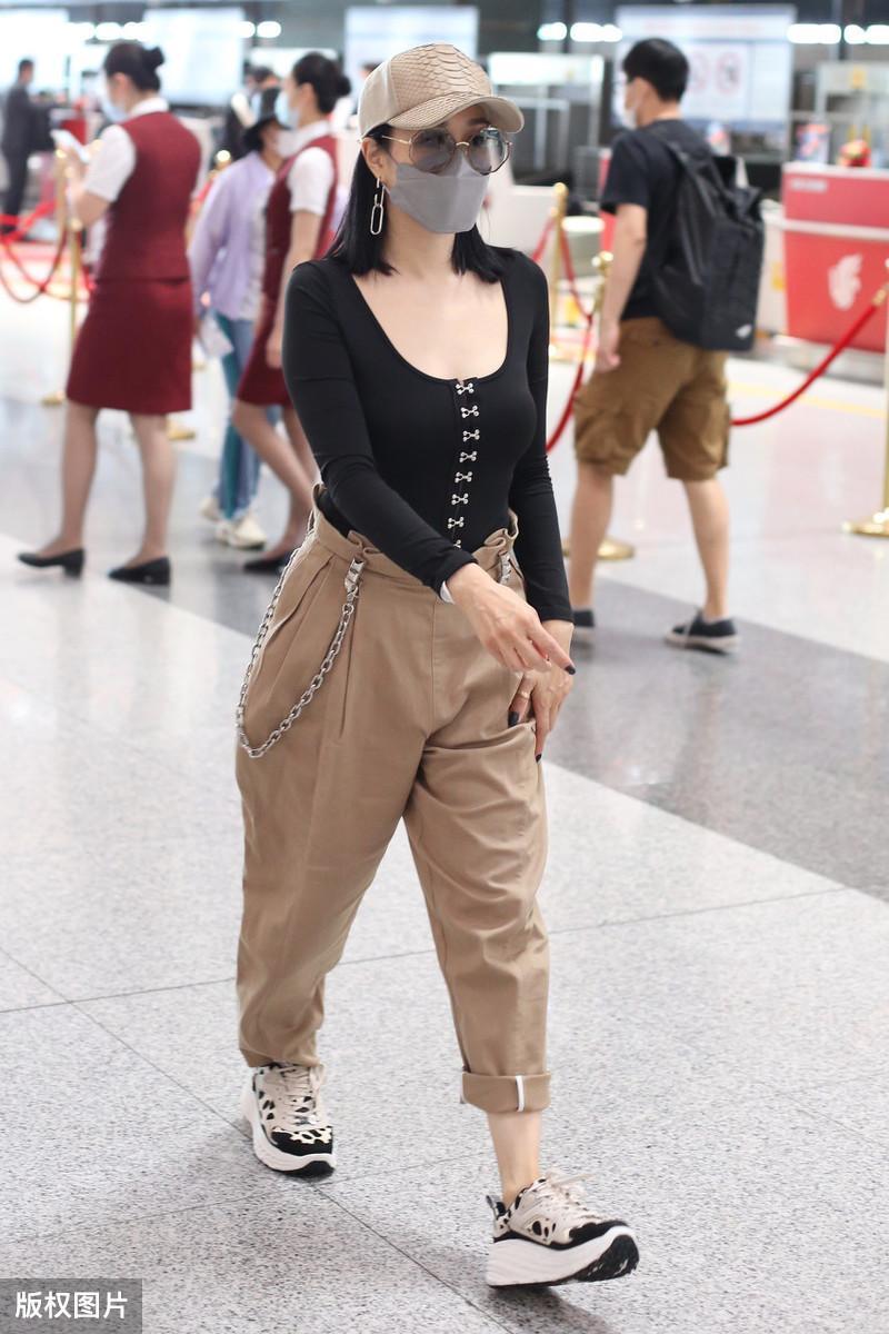 钟丽缇,黑色低胸紧身tee+卡其色工装裤+老爹鞋+棒球帽性感撩人。