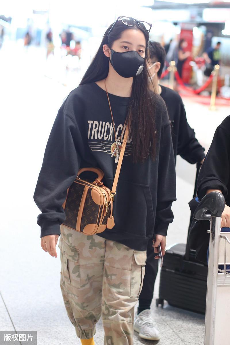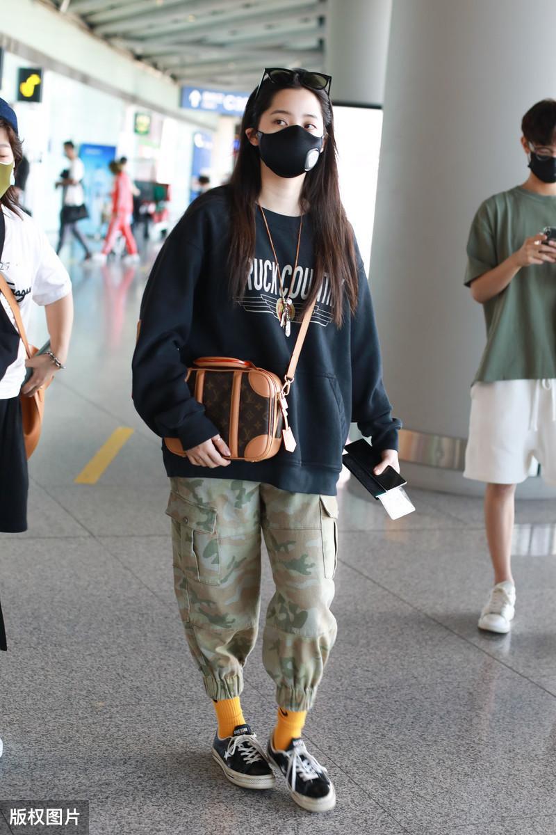 欧阳娜娜,字母卫衣+迷彩工装束脚裤+Louis Vuitton箱包+黄色短袜+运动鞋潮范