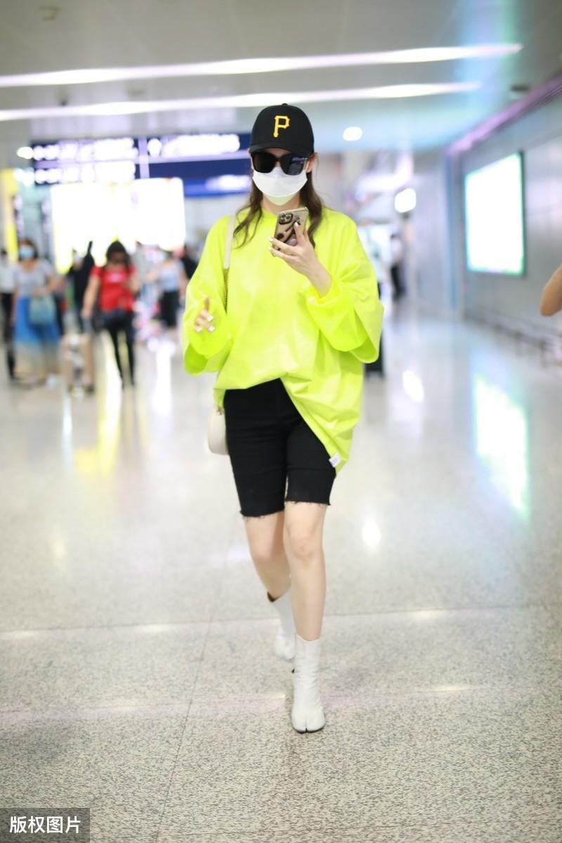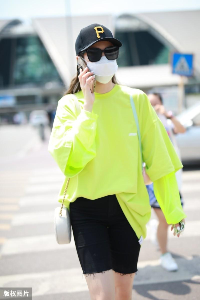戚薇,荧光绿卫衣+骑行裤运动时髦。