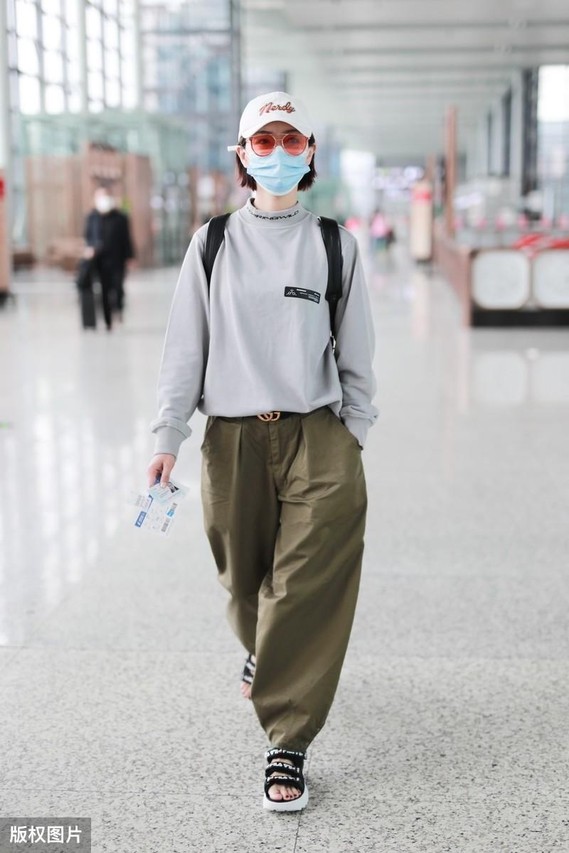 万茜,灰色卫衣+军绿色休闲裤+老爹凉鞋+棒球帽休闲随性。