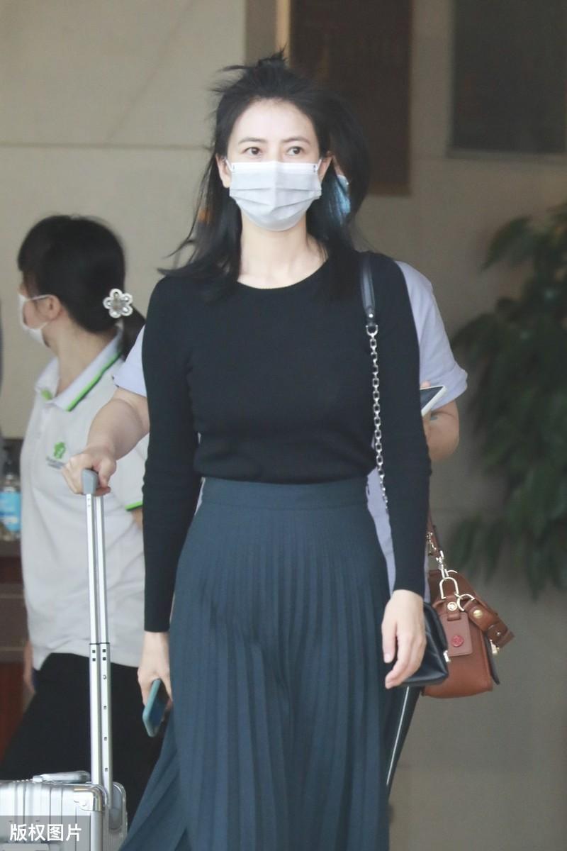 高圆圆,黑色紧身tee+百褶裙优雅女神。