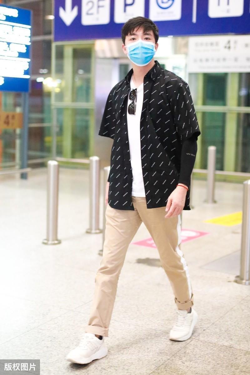俞灏明,白色T恤+印花短袖衬衫+卡其色休闲裤+小白鞋休闲随性。