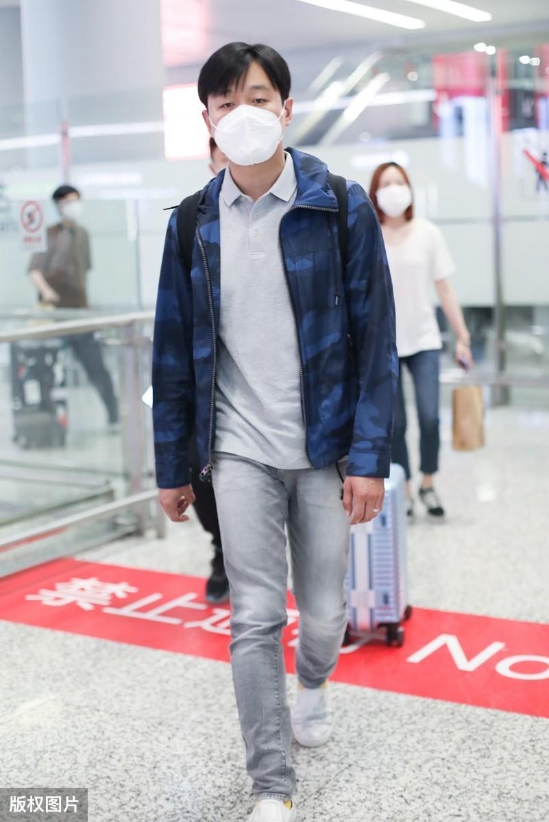 佟大为,蓝色格纹外套+灰色牛仔裤+运动鞋低调随意。