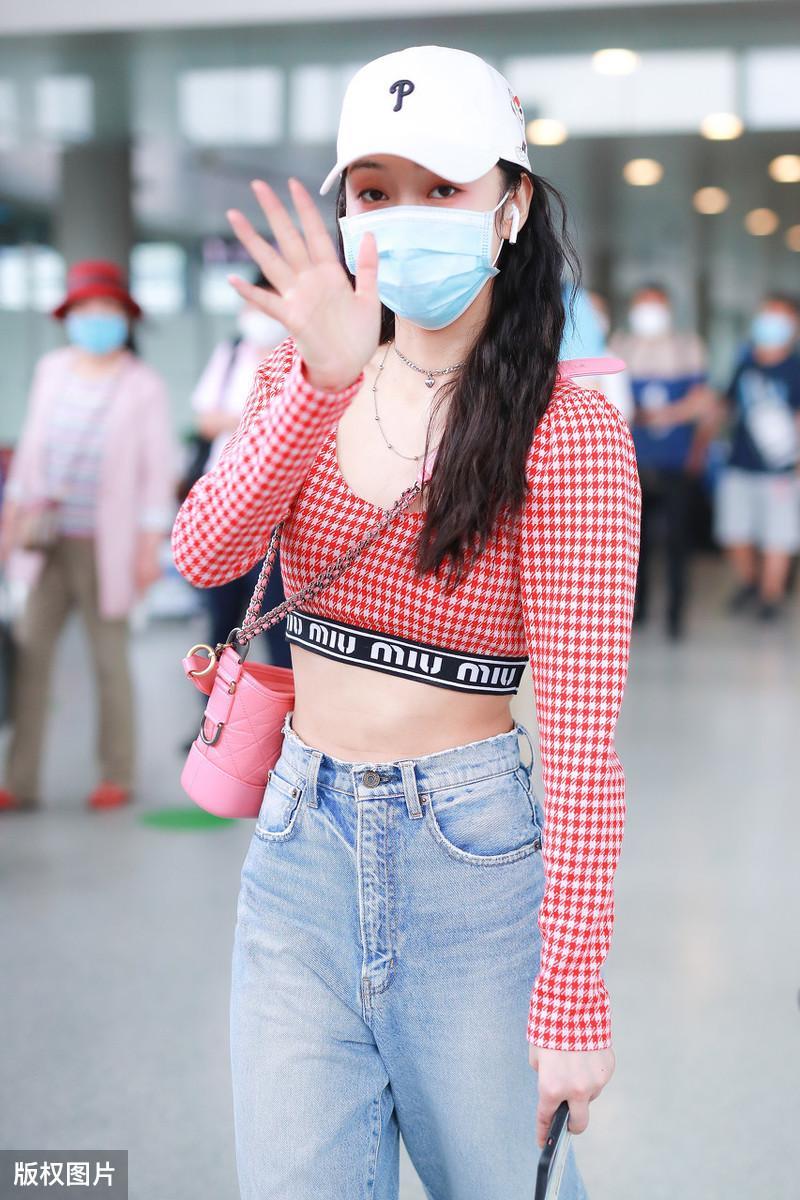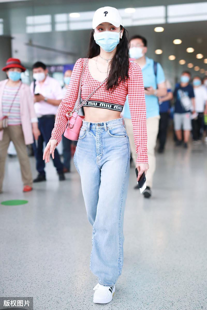 宣璐,格纹短款Crop Top上衣+阔腿牛仔裤+Chanel流浪包+小白鞋女团风。