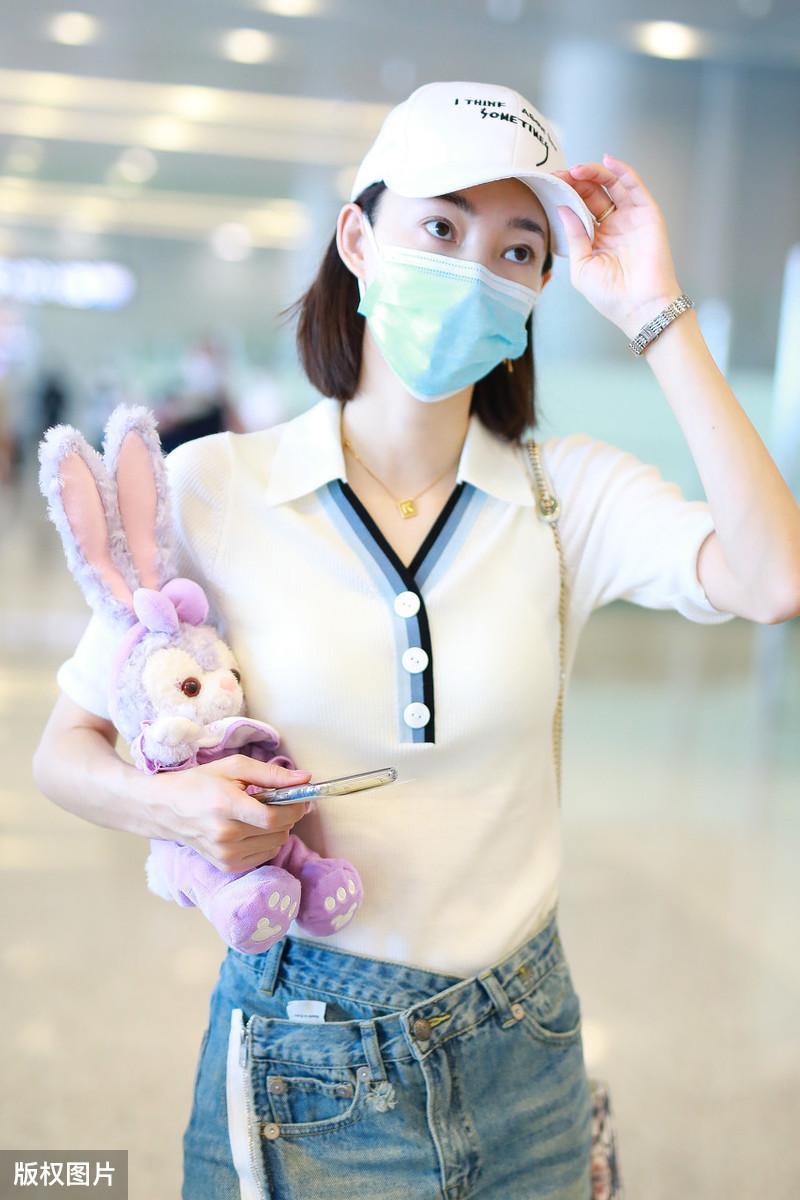 王丽坤,白色Polo衫+牛仔开衩裙+小白鞋Dior手袋+棒球帽青春靓丽。