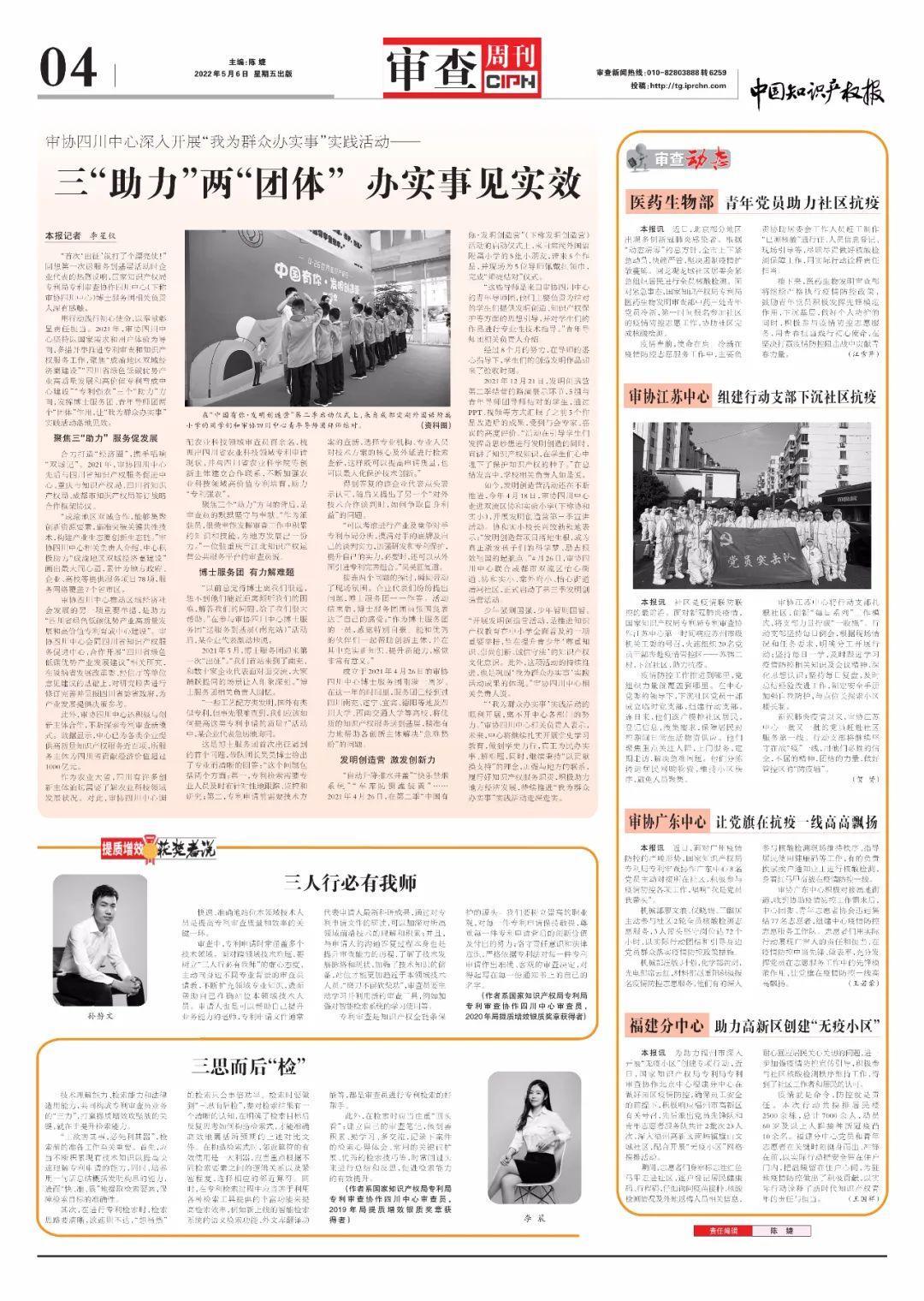 用行动践行初心使命,以奉献彰显责任担当。2021年,审协四川中心坚持以国家需求和用户体验为导向,多措并举推进专利审查和知识产权服务工作,聚焦“成渝地区双城经济圈建设”“四川省绿色低碳优势产业高质量发展和高价值专利育成中心建设”“专利强农”三个“助力”方向,发挥博士服务团、青年导师团两个“团体”作用,让“我为群众办实事”实践活动落地见效。