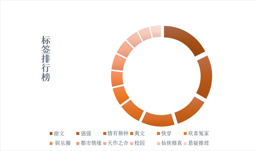 紧接着我们来讨论小说的标签,就比如之前大火的《锦绣未央》,它最大的标签就是"爽文"了。之前提到的《陈情令》的原著小说《魔道祖师》其中两个标签是"侠侣""强强"。据"晋江文学城"纯爱总分排行榜显示,小说的标签种类也是多种多样的。当然啦,其中,很多标签都是我们很常见的。就比如标签"强强",在研究的200部小说中,就有45本小说带着这个标签。而"情有独钟"这个标签也有35本,当然,有些标签出现的次数也是很少的,就比如"仙侠修真"只出现了12次。诚然,一部作品不会只有一个标签,一个标签也不会只在一部作品中。就拿"强强"这个标签来说,它还会和"悬疑推理""爽文""甜文""宫廷侯爵"等标签出现在一起。"情有独钟"会和"甜文""都市情缘""恋爱合约""破镜重圆"等标签一起出现。如图所示,我们整理了排名前十的标签。