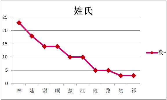 首先我们来聊聊主人公的姓名,根据在文章简介处对主角的进一步整理,我们发现在上榜的200本书中,共计有385个名字。在这385个名字中,你绝对猜不到哪一个姓氏出现的频次最高,不过有一点可以肯定的是,这位"夺得头筹"的姓氏绝对不是古早总裁小说中遍地可见的复姓上官、慕容、皇甫之类的。好了好了,不卖关子了,经过数据整理显示,频次较高的前十名姓氏依次有"林"、"陆"、"谢"、"顾"、"楚"、"江"、"段"、"路"、"贺"、"祁"(如图1所示)。另外,我们还发现,两字姓名高达215个,三字姓名数量次之,为164个,最后还有3个外国姓名,1个一字姓名,1个四字姓名,(如图2所示)还有一个人物名字更为特殊,他叫作MC断头。也就是说,如果你想成为晋江文学城的文章创作者,在给故事主人公取名字时,可以紧跟上其他作者的创作脚步选择给自己的主角取名为两字的林某、陆某。