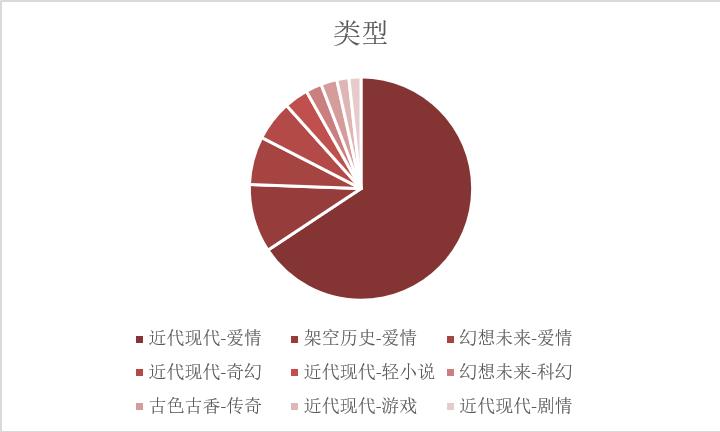 接下来我们来看看进入总分榜的作品类型,在这200本小说中9个类型中"近代现代—爱情"这一类型最受晋江签约作者欢迎,200本上榜小说中有113本是这个类型;16本小说是关于"架空历史-爱情"的;而前几年流行的仙侠小说在最近几年已经大势而去了,上榜的小说的"原创-纯爱-架空历史-仙侠"只有3本。唉,朕还指望多吃几颗长生不老丸修仙成为一名英雄盖世的仙侠呢!如图4所示: