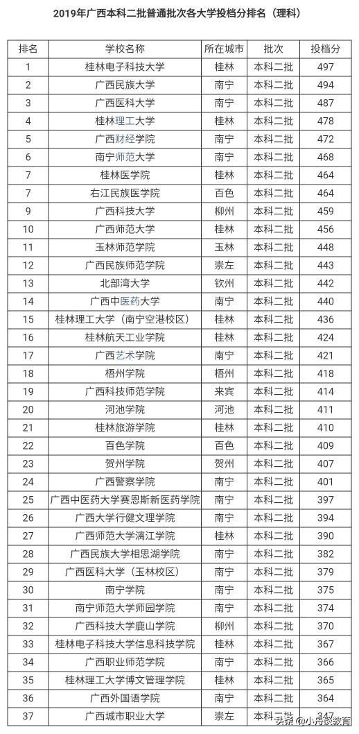 说明:自2015年开始,广西高考本科二批、三批合并为本科二批招生,以下数据包含曾经三批招生的学校,也有些大学的部分专业也在本科二批招生。这里的数据为各高校本科二批招生专业的最低投档分。