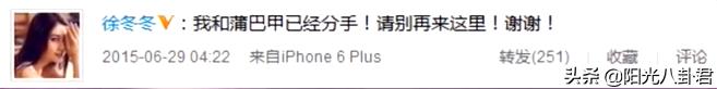 不过很遗憾的是相恋仅一年后,徐冬冬在2015年06月29日凌晨微博发文证实二人已分手:“我和蒲巴甲已经分手!请别再来这里!谢谢!”