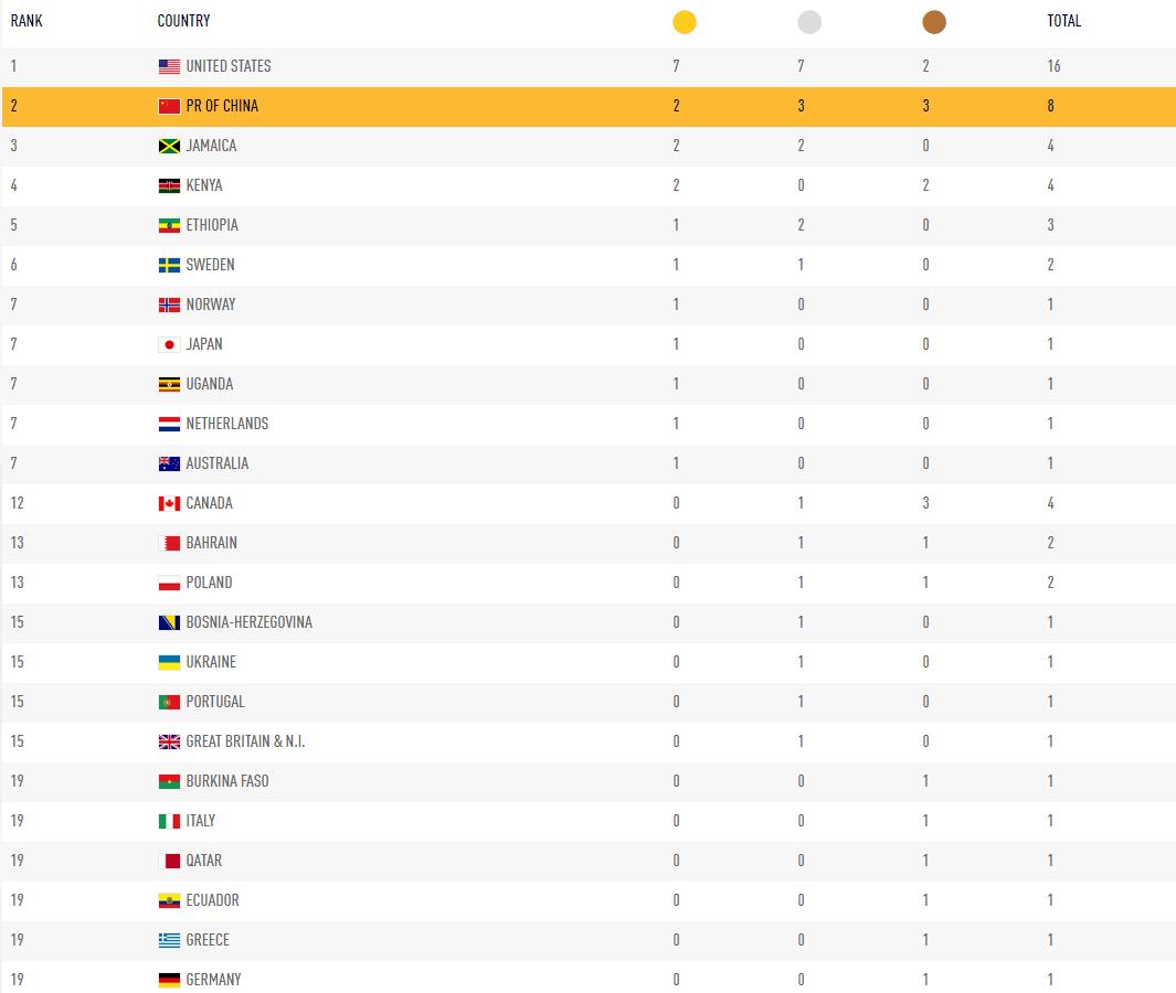世锦赛奖牌榜:美国7金一骑绝尘 中国8枚奖牌超上届 标枪遗憾丢金