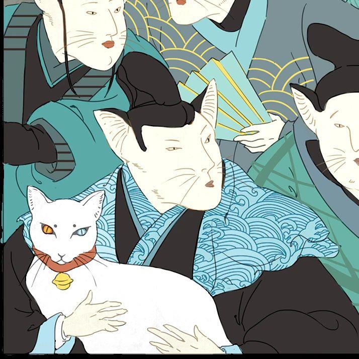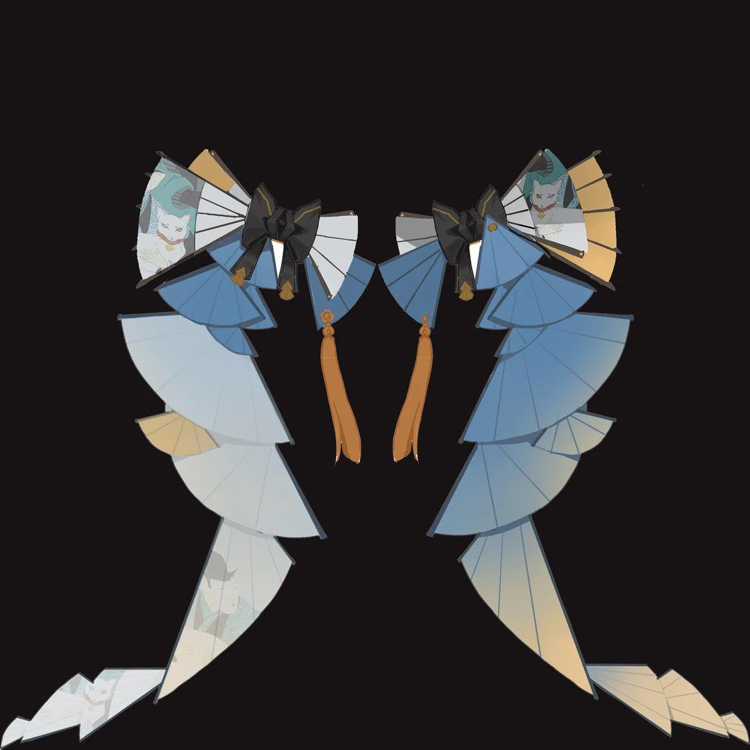 扇子边骨是立体的狮猫外形,芯骨使用了金色质感的材料提亮,扇面隐约可见与服饰呼应的暗纹,扇钉则使用了猫尾元素,收拢后又形若一只猫。