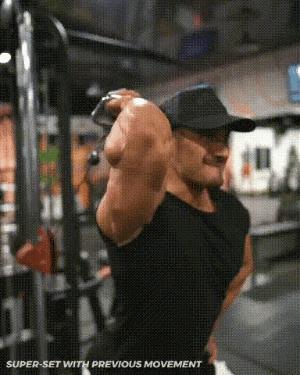 动作要领:背对绳索站立,腰背部挺直,核心收紧。一只手臂向上举过头顶,小臂后弯,手握住把手。大臂尽量不动,肱三头肌发力,手臂向上伸,大臂和小臂一条直线后稍作停留,再缓慢还原。