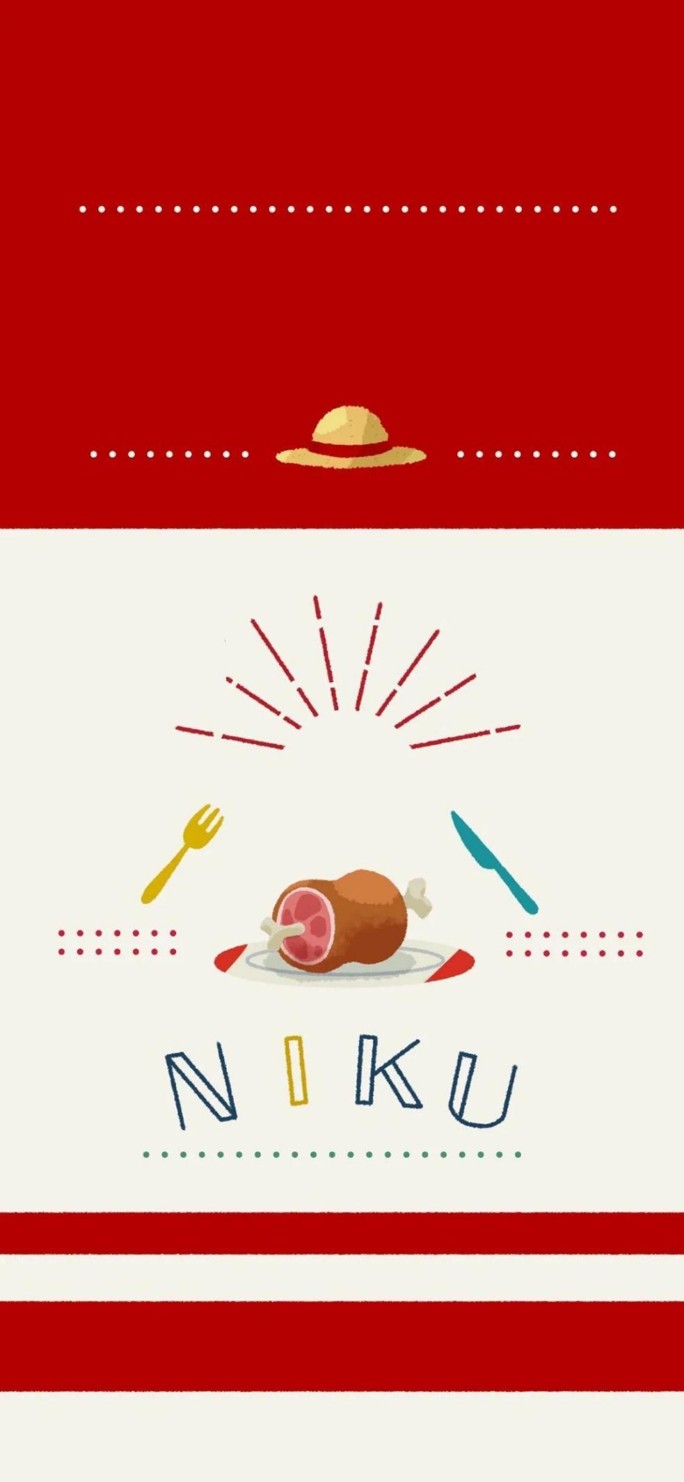 路飞壁纸的上方是一顶草帽,这是路飞的标志。然后下面是一盘肉,这呈现了路飞吃货的本质。盘子的小面还写有"NIKU"的字样,这是"肉"在日语里的发音。