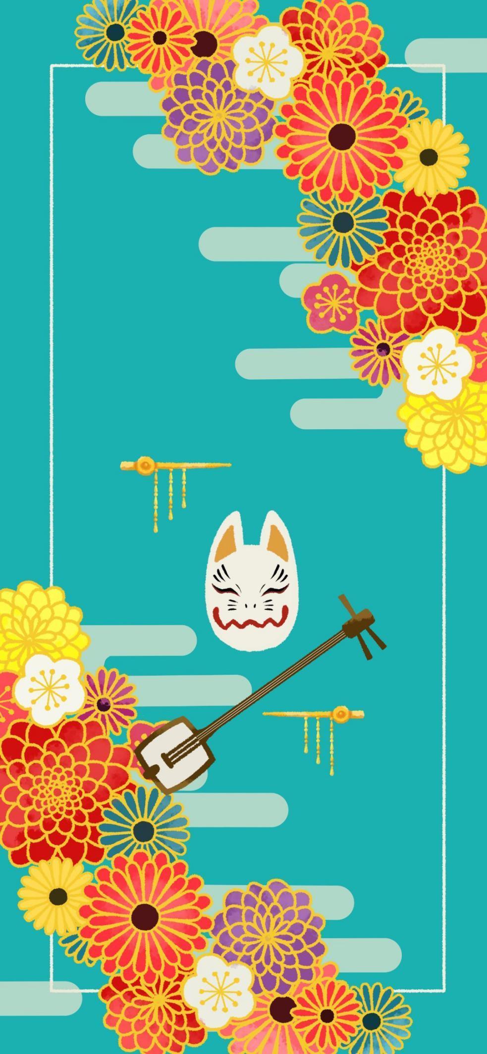 小紫壁纸的颜色就是小紫的发色,图的右上角和左下角有着盛开的花朵,这象征的是小紫和之国第一美人的身份。然后图中央的面具和琴则对应了她艺伎的身份。