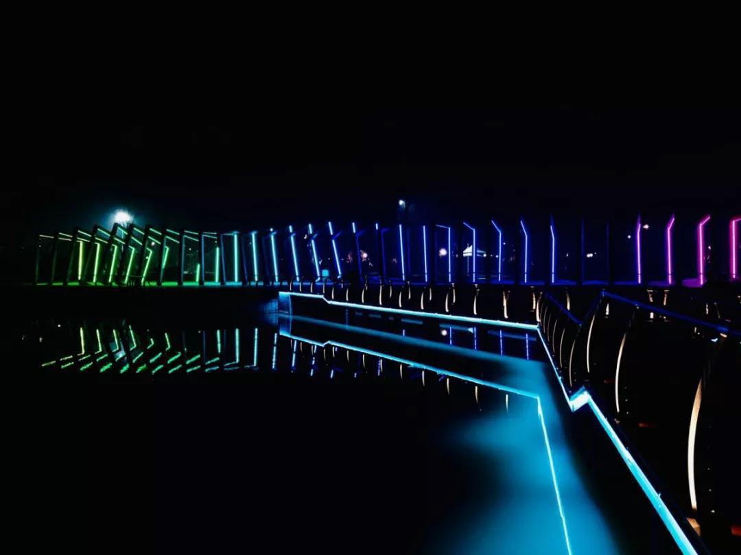 梦湖公园的夜景灯光色彩丰富,覆盖了园内林木、环湖栈道、桥梁廊架等,多彩纷呈,动静结合,行走其间,静谧、梦幻,恍入梦中。沿着湖泊而设的木栈道上,以淡蓝色为主色调的亮化设计,梦湖自然融合,相得益彰,透着江南水乡的雅致和韵味。公园还专门建设了三处特色景观廊架,有宛如时空隧道的不规则形,也有色彩斑斓的门形,是拍照的好地方。