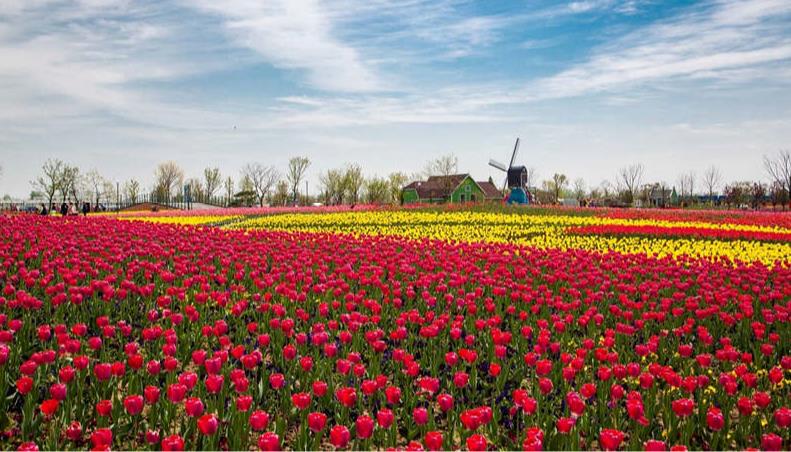 四:荷兰花海(盐城市大丰区新丰镇淮海西路),整个花园好大好大,布满了各种各样的鲜花,造型别致,分类清楚,感觉到了花海的美,在室内鲜花棚里, 景区以“田园、河网、建筑、风车、花海”为设计元素,,打造集观光旅游、餐饮娱乐、种植研发于一体的具有荷兰风情的花海。