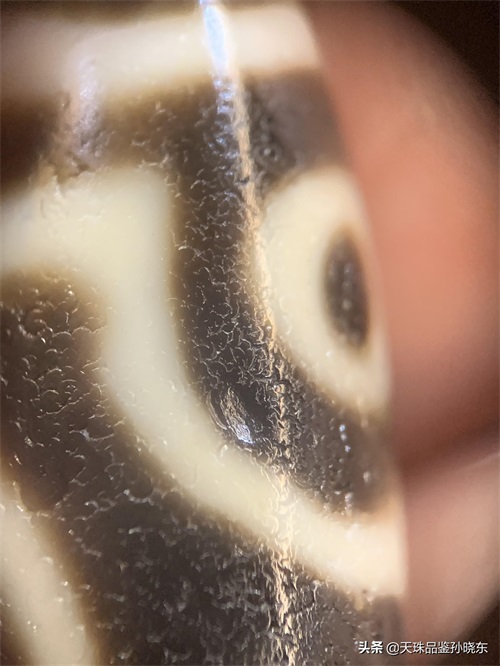 再细看这颗珠子表面坑坑洼洼不规整,这是做旧的手法具体使用利器敲打还是酸液浸泡不得而知,老天珠会出现风化纹但绝不是这种坑,而是月牙形马蹄纹,并且分布自然不会扎堆深浅不一,是缠丝玛瑙自然开裂形成,根据保存环境会出现差异,有的老天珠甚至极少有风化纹。