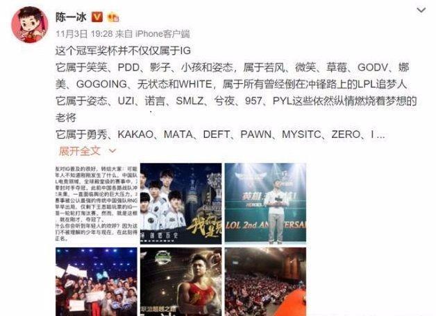 小编求了度娘才知道原来这里面还颇有些渊源,在2018年的11月份,iG 在LPL赛区以3:0击败外国强敌fnc首次夺得S级系列赛总冠军的好消息马上传遍全国,这是《英雄联盟》这款多人对战游戏发布七年多以来,首次获得此殊荣。而此时陈一冰发表文章。称iG的辉煌成就不单单属于iG,而是将此荣耀归功于所有在这条路上不断奋斗的人,当凑巧其中就提到了uzi。