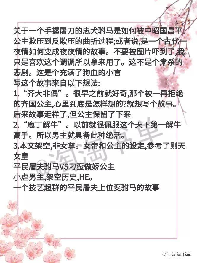 男主是屠夫,忠犬人设,“被占完便宜”,自此对公主念念不忘。之后过了两年,公主比武招驸马,本来女皇已经安排好了中意的世家子,却被狂妄的敌国世子搅了局,还以城池为赌注要娶公主。公主当场立誓,谁能打败敌国世子就嫁给谁,无论是高门贵子,还是贩夫走卒。当然,就是男主挺身而出了。