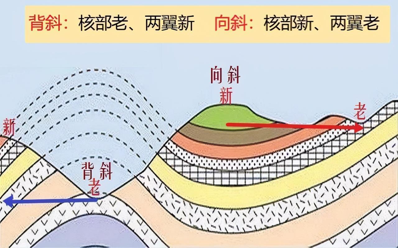 当岩层两侧受到挤压,便会发生弯曲,形成背斜和向斜。背斜、向斜的判断,主要有两种方法: