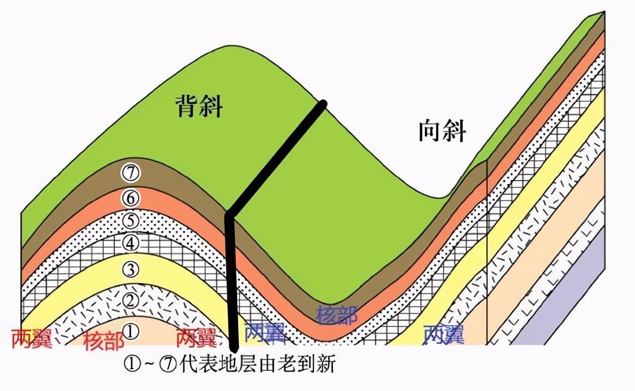 ②根据岩层的年代。中间老、两侧新的为背斜,中间新两侧老的为向斜(这里说的中间,即为下图中的“核部”;两侧,即为下图中的“两翼”)。