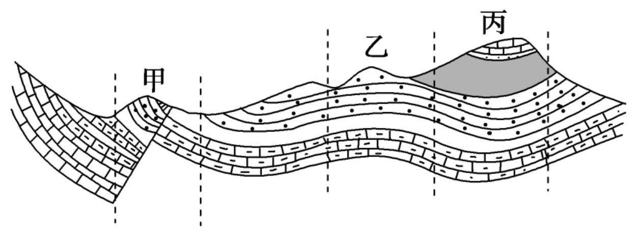 (2)分析乙和丙的地质构造。①判断一个地区的地质构造,应当分析地下的岩层形态,而不是地表形态;②乙处地下的岩层向上凸起,因此为背斜;③丙处地下的岩层向下凹陷,因此为向斜,因此甲乙丙三地依次为断层、背斜、向斜,选项B正确。