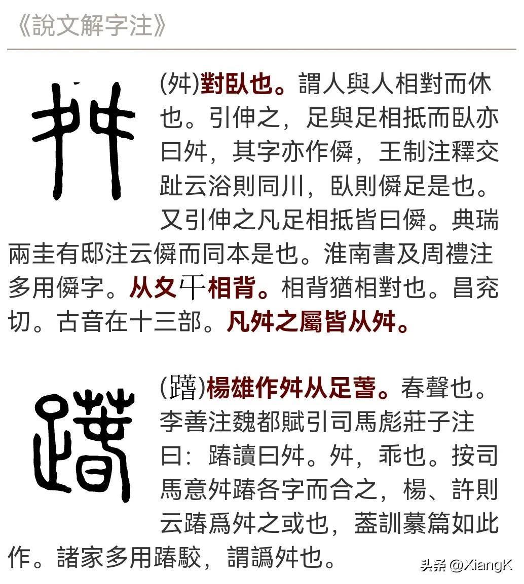 ①「说文解字」中: 對臥也。从夊 相背。凡舛之屬皆从舛。「“谓人与人相对而休也,相背,犹相对也。”」