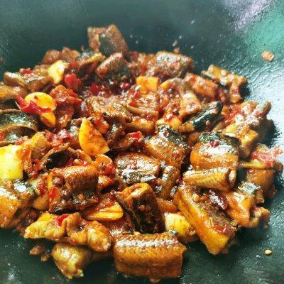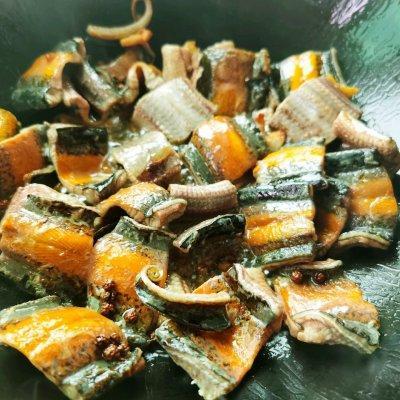 4、加入花椒粒爆香后下入鳝段,翻炒爆香。