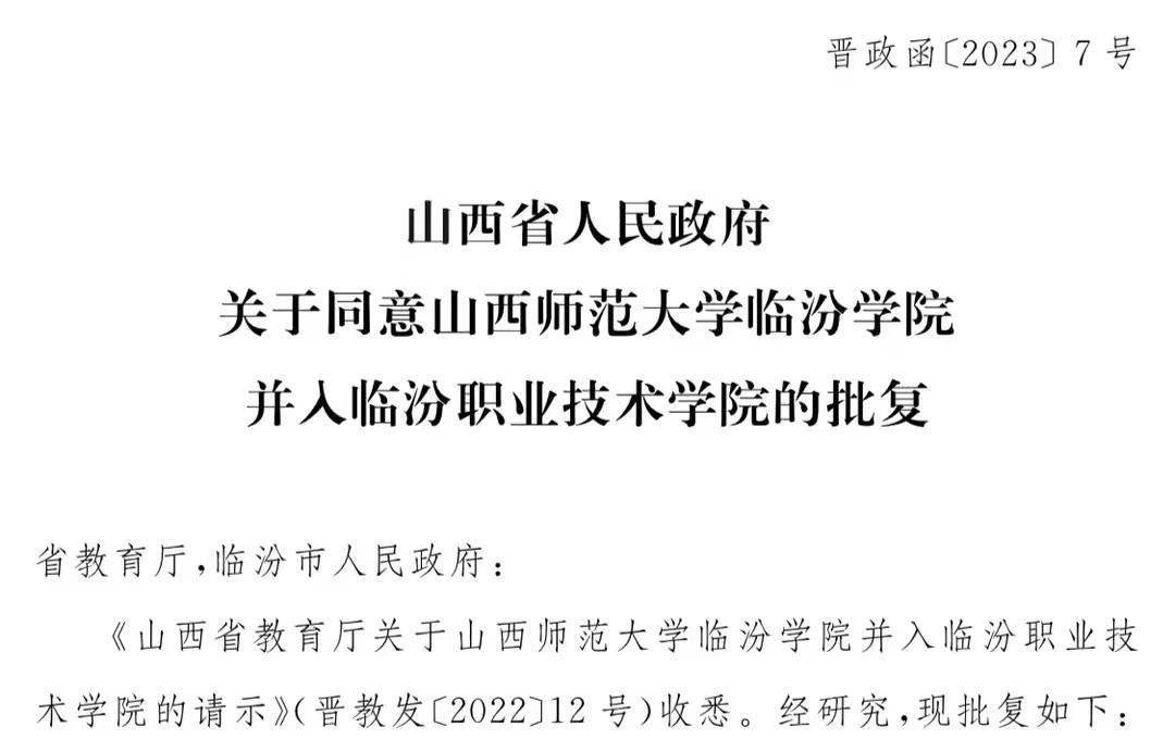 近日,山西省政府发布了一个批复,同意了山西师范大学临汾学院并入临汾职业技术学院,大概意思就是这所学校整体建制全部并入临汾职业技术学院,当然了,近几届的毕业生的毕业证不会受到影响,该是哪所学校颁发的还是哪所学校,可能2023届大一新生就不一样了。