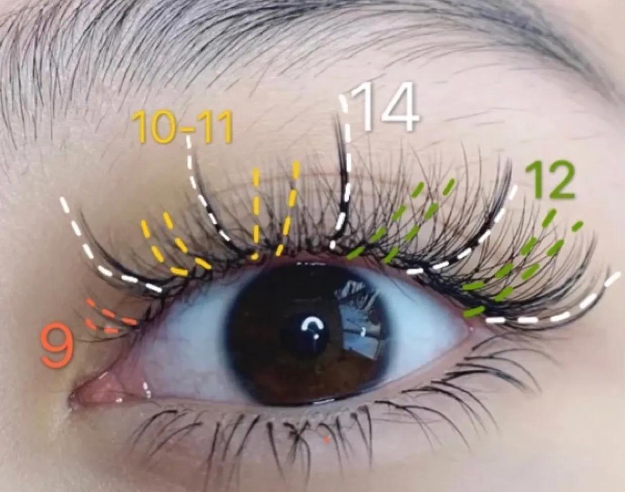 把上面这张图给美睫师看就ok了~如果是第一次接睫毛,想要更自然一些,就把长度缩短到8~11mm、13mm单根定点,C翘即可。