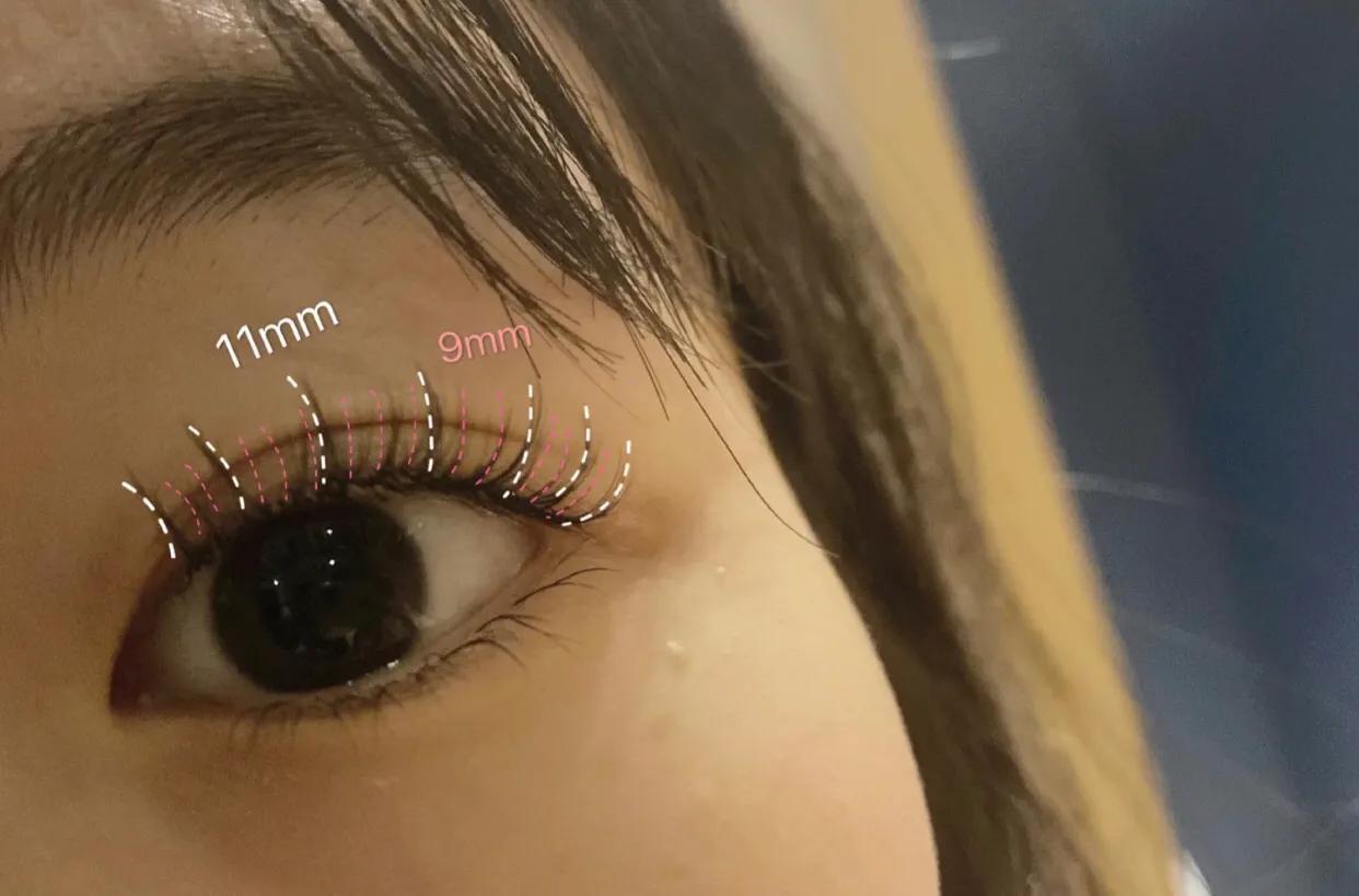 想要这种有一些狐狸眼上扬的效果,就和美甲师说前短后长,眼头9mm过渡到眼尾12、13左右。