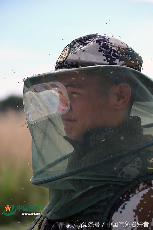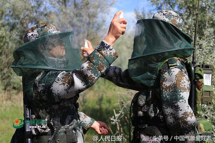 但就是这样一个蚊虫肆虐的地区,新疆军区北湾边防连的官兵们仍然不畏惧辛苦,忠实履行着边防执勤的神圣使命。每天,官兵都要互相帮忙戴上防蚊帽,检查防护服,喷洒驱蚊液,才能放心的上路开始巡逻。但即便有了防护服,有时还是难以逃脱细小蚊虫的叮咬,形成一片片的红包。