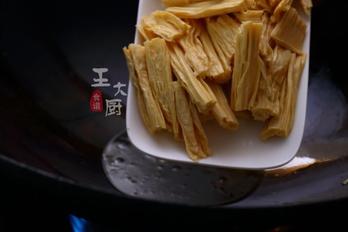 4、另起锅烧油,将准备好的腐竹放在锅中,进行翻炒。