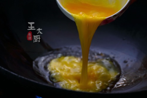 3、起锅烧油,将准备好的鸡蛋液放在锅中,进行翻炒,之后盛出来。