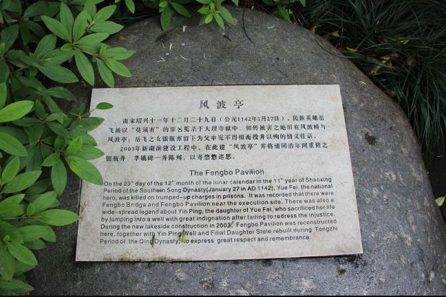 在历史上风波亭大大有名,但不是什么好名。风波亭,南宋时期为杭州大理寺狱中的亭名,在公元1142年1月27日,在此以“莫须有”的罪名将一代抗金名将岳飞及其儿子岳云、部将张宪杀害。借用后人一句话:青山有幸埋忠骨,白铁无辜铸佞臣。