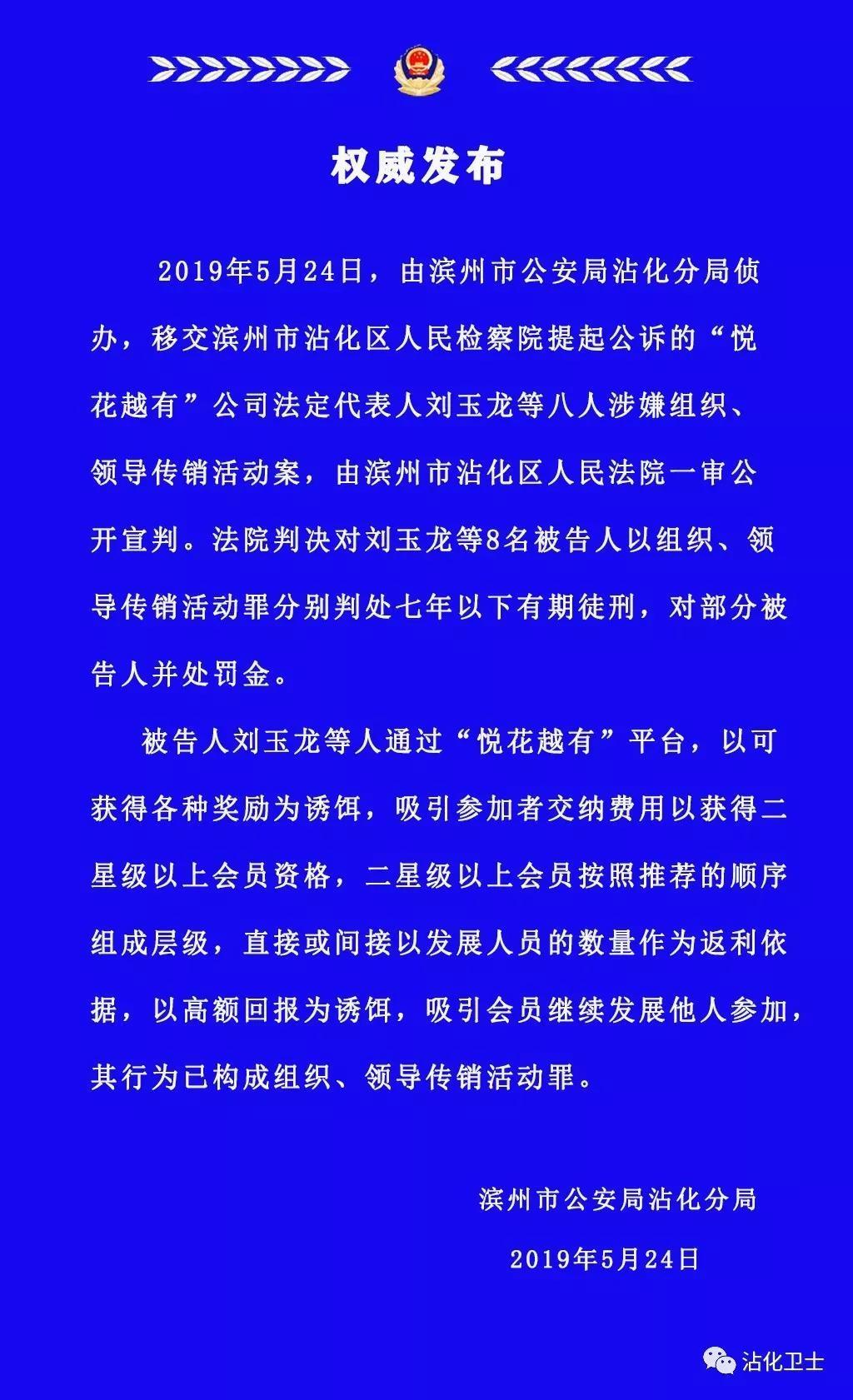 5月24日,由滨州市公安局沾化分局侦办,移交滨州市沾化区人民检察院提起公诉的“悦花越有”公司法定代表人刘玉龙等八人涉嫌组织、领导特大网络传销活动案,由滨州市沾化区人民法院一审公开宣判。沾化区人民法院判决对刘某龙等8名被告人以组织、领导传销活动罪分别判处七年以下有期徒刑,对部分被告人并处罚金。