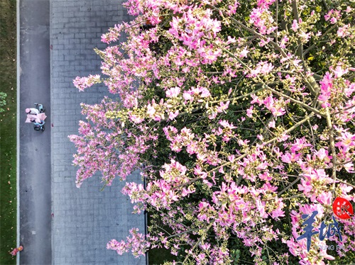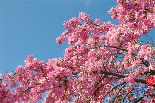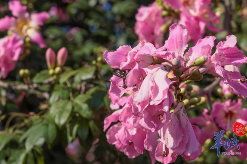 花朵的鲜艳色彩和香气吸引了蝴蝶前来采蜜,同时,这几株美丽异木棉也成为了当地的热门打卡地点,吸引了众多路人前来拍照留影。