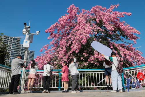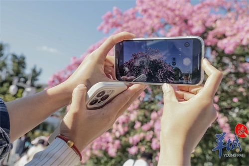 游客们聚集在美丽异木棉前,满怀兴奋和好奇。他们迅速拿出相机、手机,寻找最佳的拍摄角度。