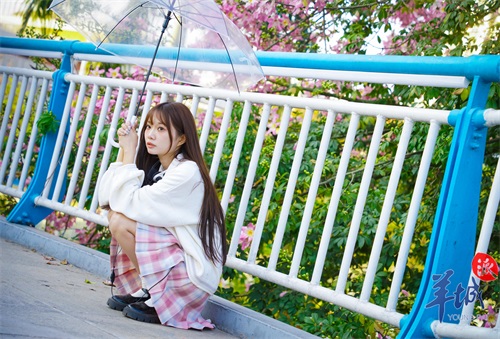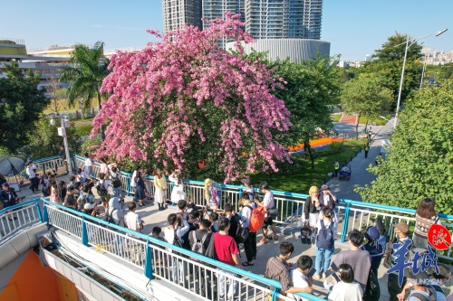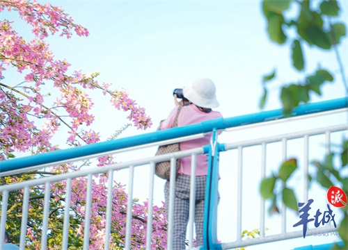 位于白云区萧岗地铁站附近的一座天桥两边,分别种植了几株美丽异木棉。不少游客来此拍照留影。