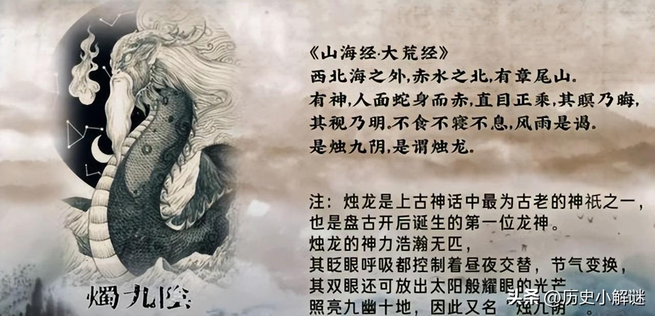 《大荒北经》:“西北海之外,赤水之北,有章尾山。有神,人面蛇身而赤,直目正乘,其瞑乃晦,其视乃明,不食不寝不息,风雨是谒。是烛九阴,是烛龙”