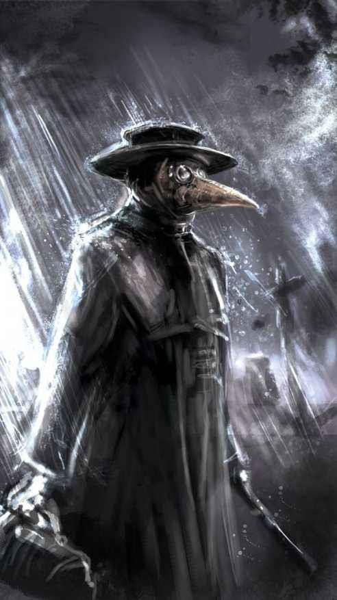 十四世纪四五十年代。 “黑死病”席卷了整个欧洲大陆。在这场大灾难之中,出现过这样的一个形象“全身从头到脚披 着防油布制成的黑色大衣,双手也用厚实的手套包起来,戴着宽大的帽子,在帽檐底下赫然是一张状如鸟嘴的面具。”