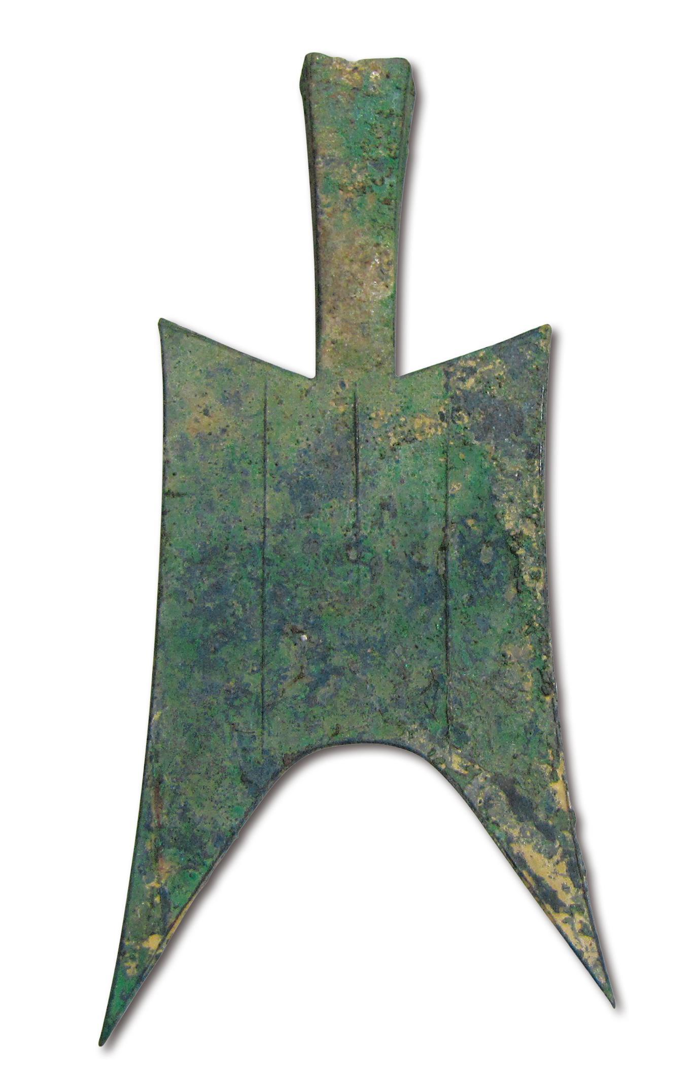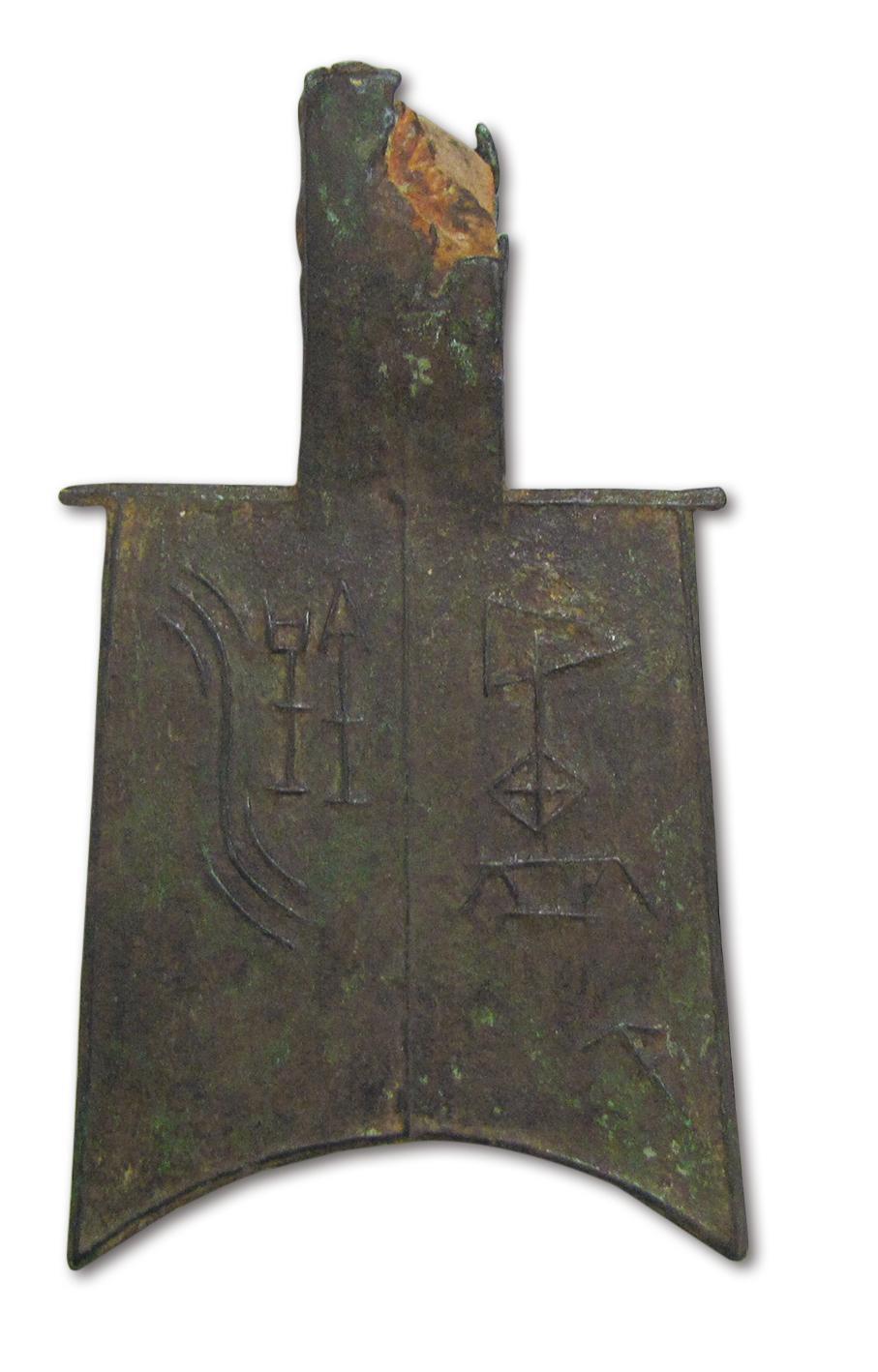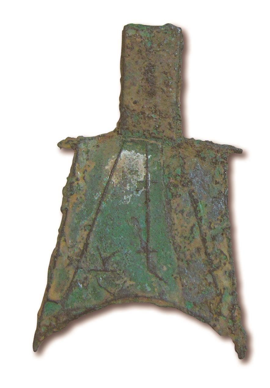 耸肩尖足空首布,两肩向上耸起,足部下端尖锐。 耸肩尖足空首布主要铸行于春秋中期到战国初期黄河 以北的晋(赵)、卫地区。耸肩尖足空首布按照是否有钱文可以划分为有钱文和无钱文两类。