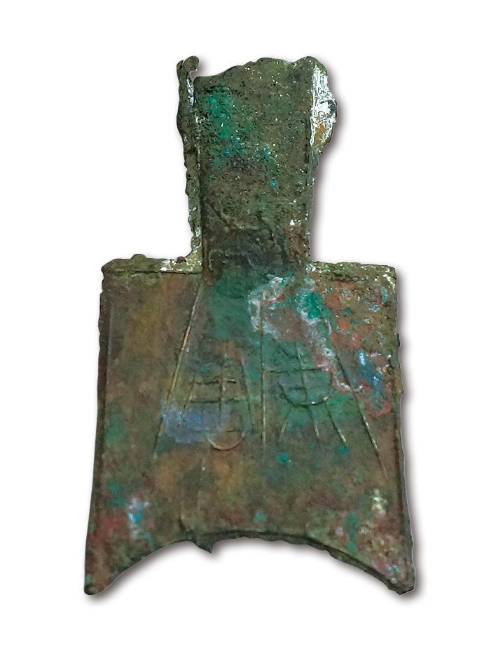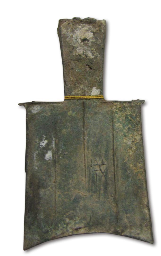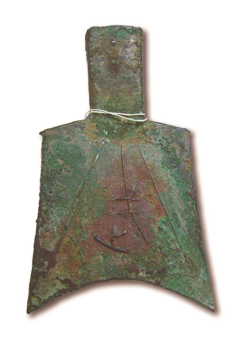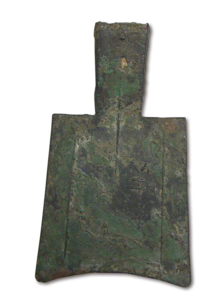 馆藏战国“成” 平肩弧足空首布 ,长 9.8、宽 5.5 厘米,钱面铸有钱文,原释“藏”,或释“成”,钱文应为记名物。