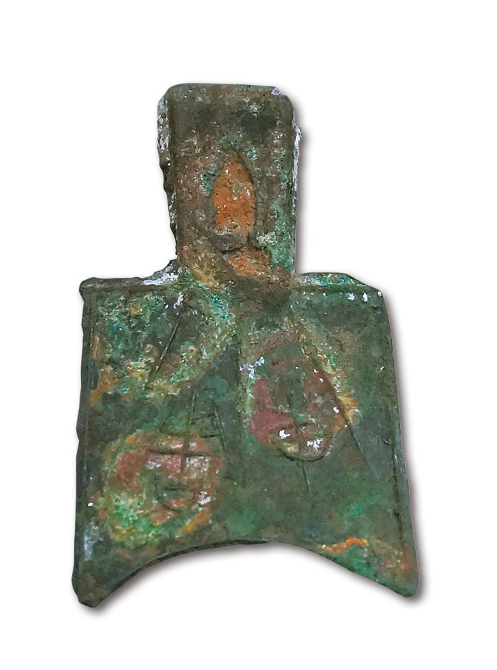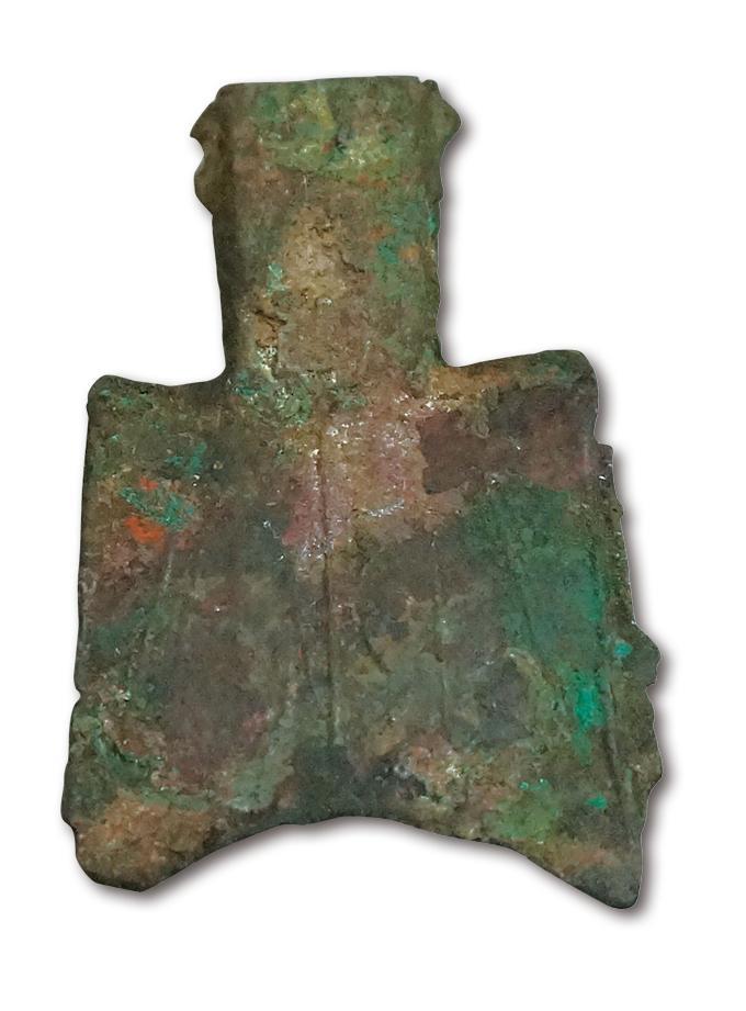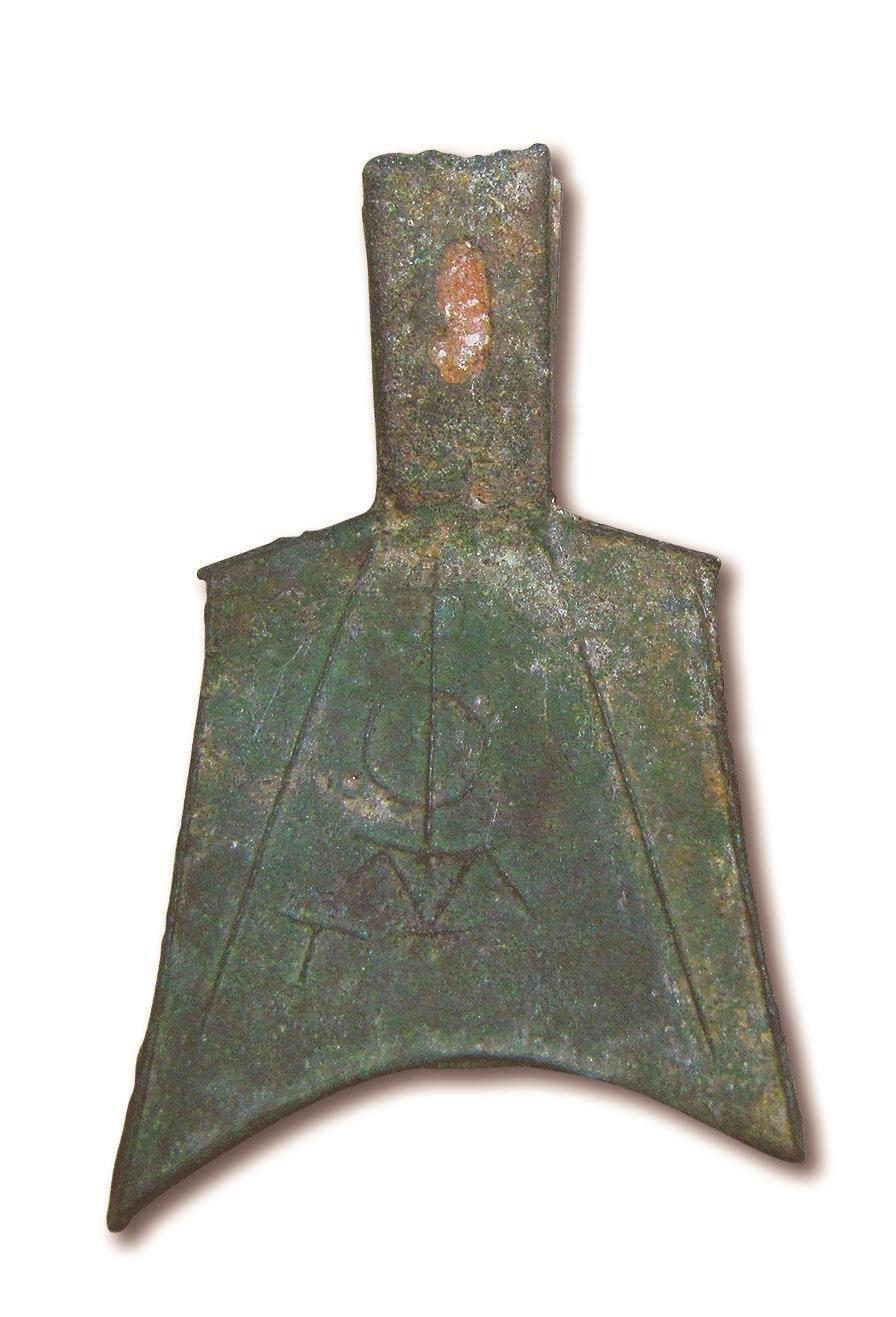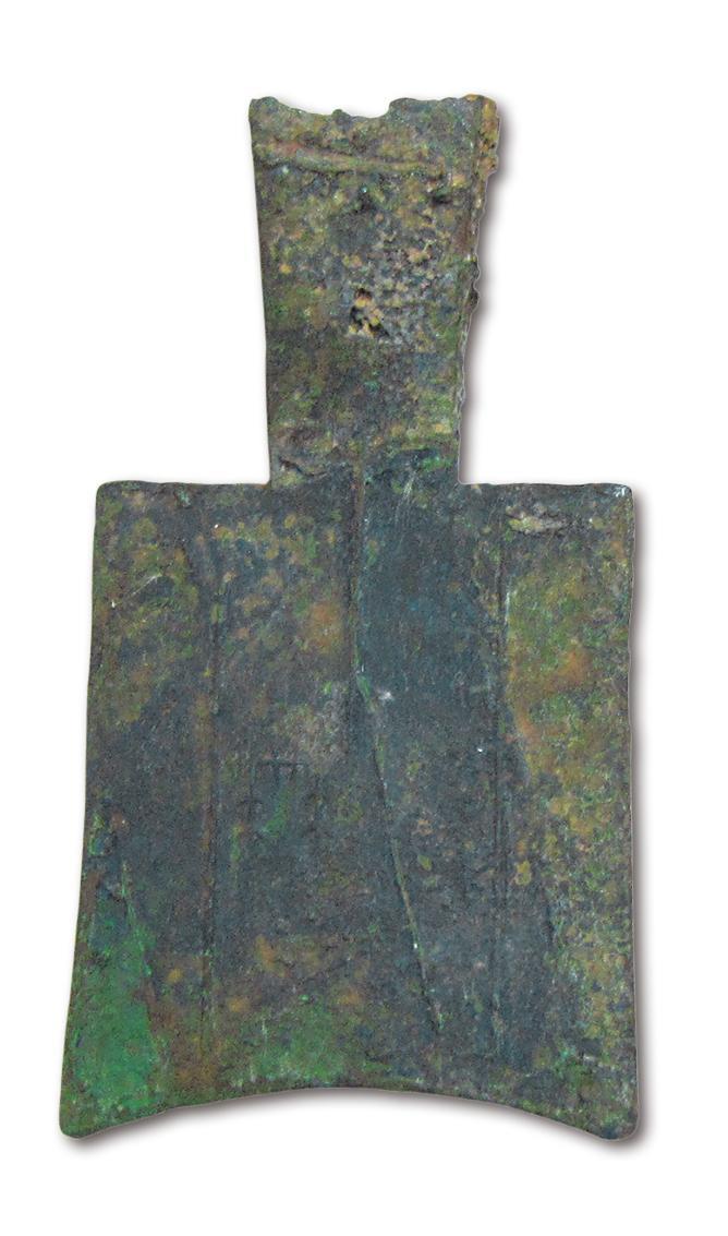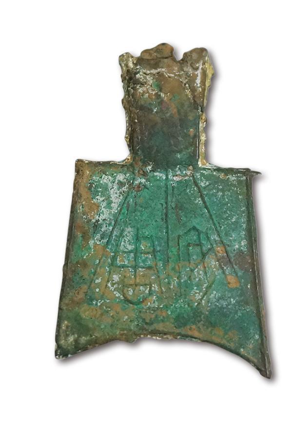 馆藏战国“成” 平肩弧足空首布 ,长 9.8、宽 5.5 厘米,钱面铸有钱文,原释“藏”,或释“成”,钱文应为记名物。
